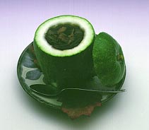 | 冬瓜の印籠蒸し | まるごとの冬瓜をくりぬき、その中に椎茸、かしわ、玉葱を入れ、とろみを付けただしと共に1時間ほど蒸したもの。調理に時間がかかりますので、ゆっくりと他の献立を楽しみながらお待ちください。時期は5〜11月半ば頃まで。ところで夏が旬だというのに「冬瓜」と書くのはこれいかに? | |